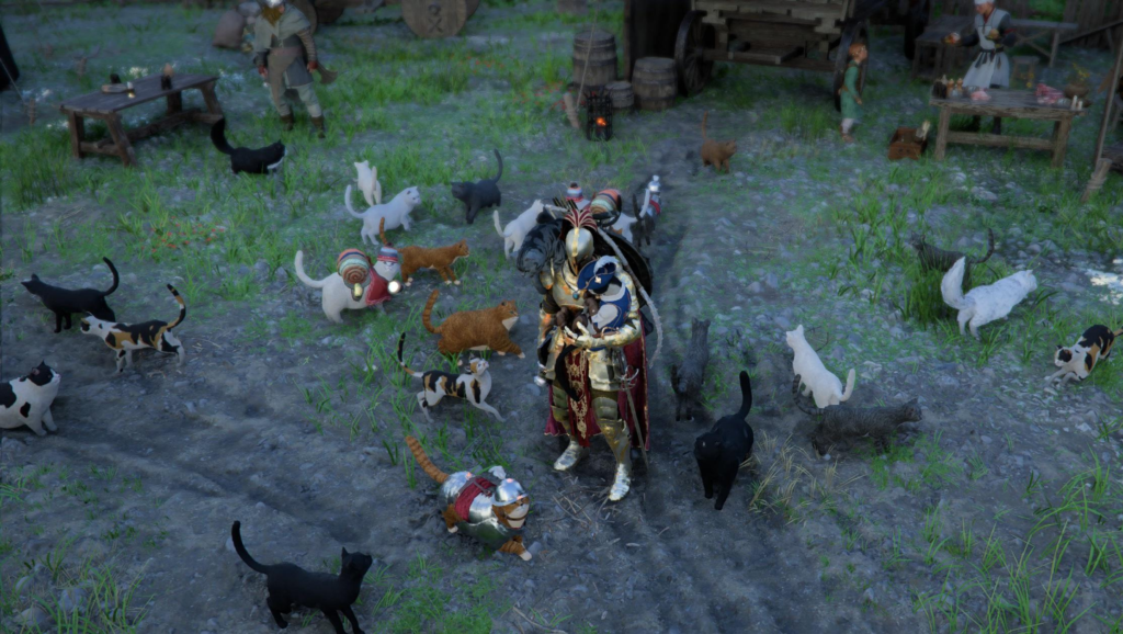 O detalhe curioso é que a história principal não gira em torno de “criar” gatos no sentido literal. Na prática, o sistema de pets de Crimson Desert é algo paralelo que permite adotar cães e gatos espalhados por Pywel.