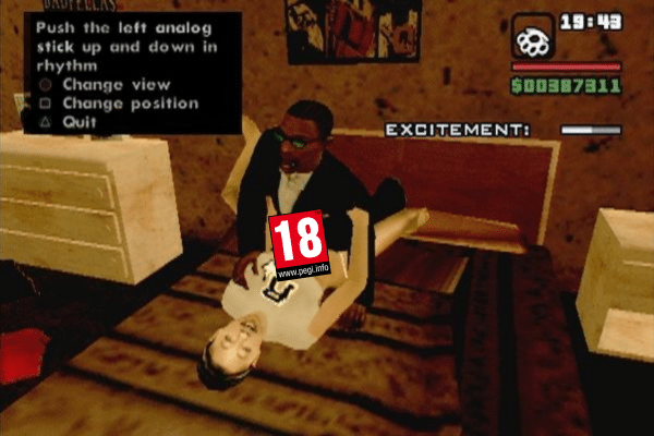 Só que, dentro do código, havia algo bem mais explícito. Os desenvolvedores chegaram a criar um tipo de minigame sexual interativo, com CJ e a namorada em cenas animadas, controladas pelo jogador. Para tentar manter a classificação Mature, a Rockstar North bloqueou o acesso a esse conteúdo, mas não o removeu do disco.