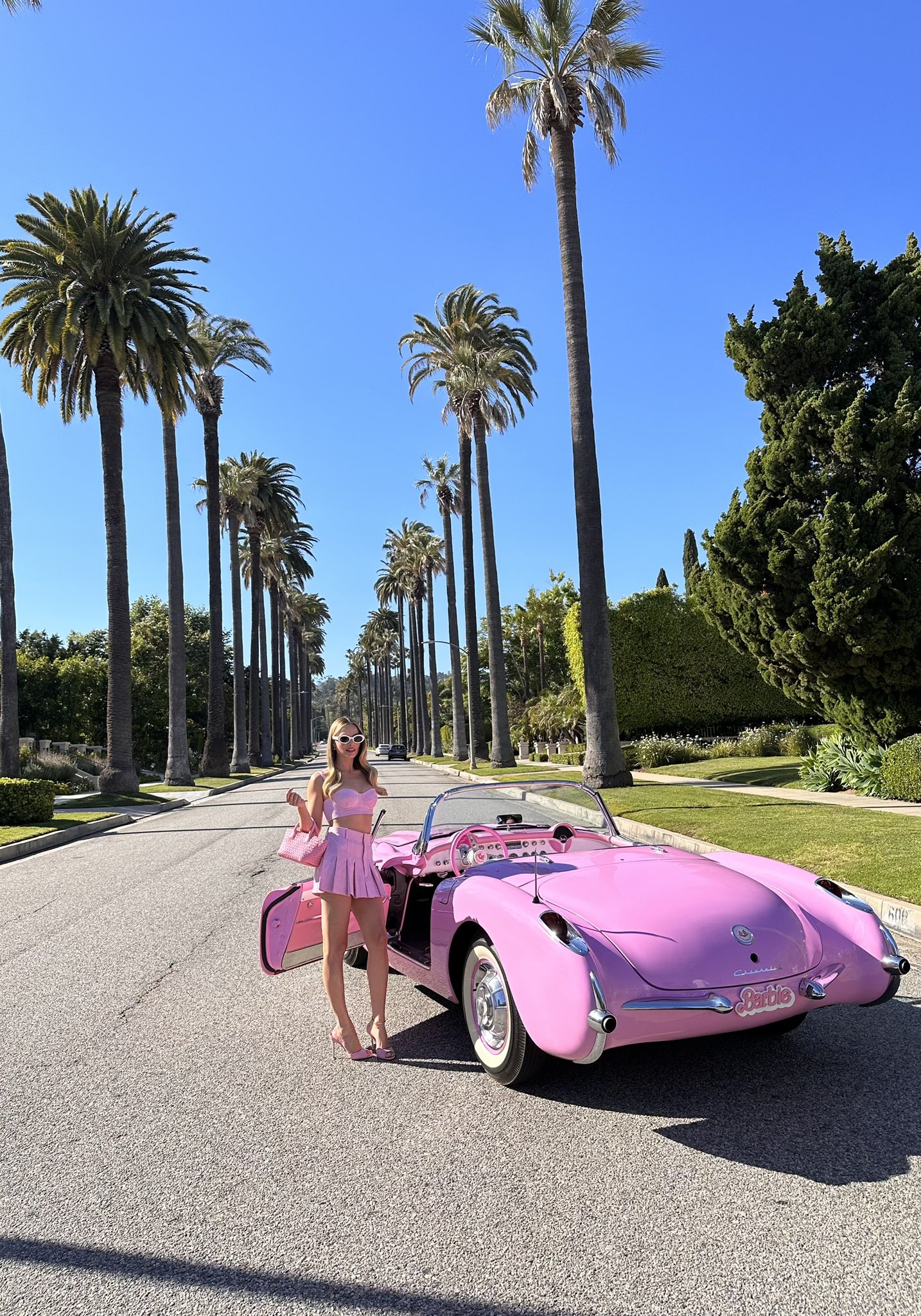 O twitter oficial do filme da Barbie divulgou fotos de Margot Robbie dirigindo o carro da icônica boneca. Assim, a atriz aparece, loura, linda e sorridente no possante cor de rosa.