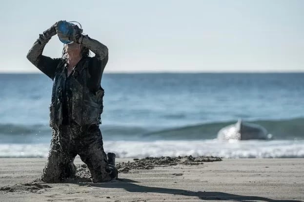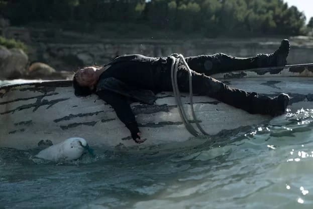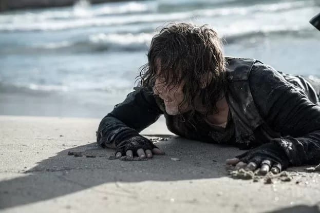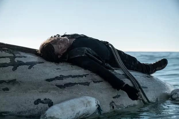 Dessa forma, nas fotos vemos Daryl inconsciente amarrado com uma corda a um pequeno barco virado, chegando à costa francesa.