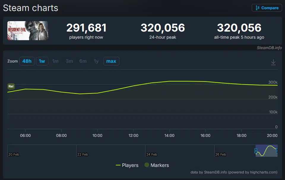 Segundo os dados do SteamDB, Resident Evil Requiem atingiu 320.056 jogadores simultâneos como pico máximo, poucas horas após a liberação. Enquanto isso, no momento do registro, o contador ainda mostra mais de 292 mil pessoas jogando ao mesmo tempo.